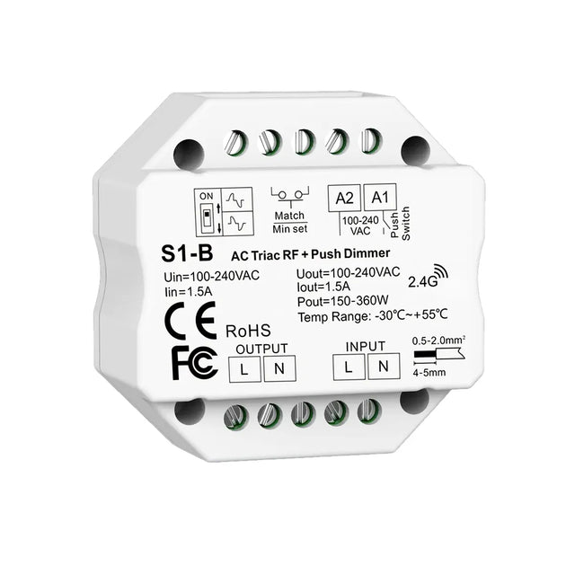 Deze LED-drukdimmer met fase afsnijding of fase-aansnijding (trailing-edge en leading-edge) is een type dimmer dat kan worden gebruikt om de helderheid van LED-lampen te regelen via een drukknop of draadloos met een RF afstandsbediening. De dimmer heeft een dip-switch waarmee u kunt kiezen of u fase afsnijding of fase-aansnijding wilt gebruiken.